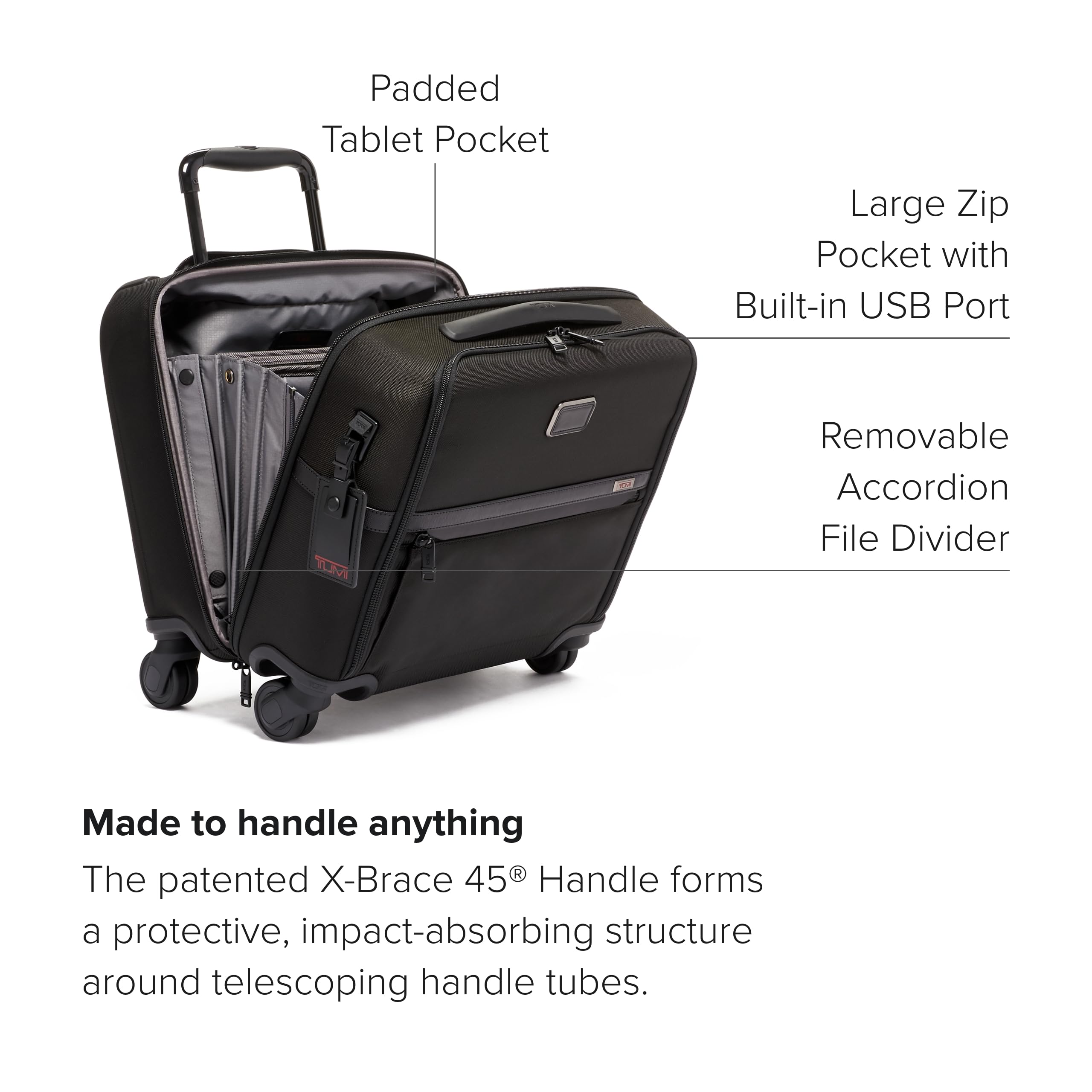 - Rolling Briefcase with Compact Design: This TUMI Compact 4 Wheeled Brief boasts a versatile, compact design that makes it the ideal carry on bag for business travelers