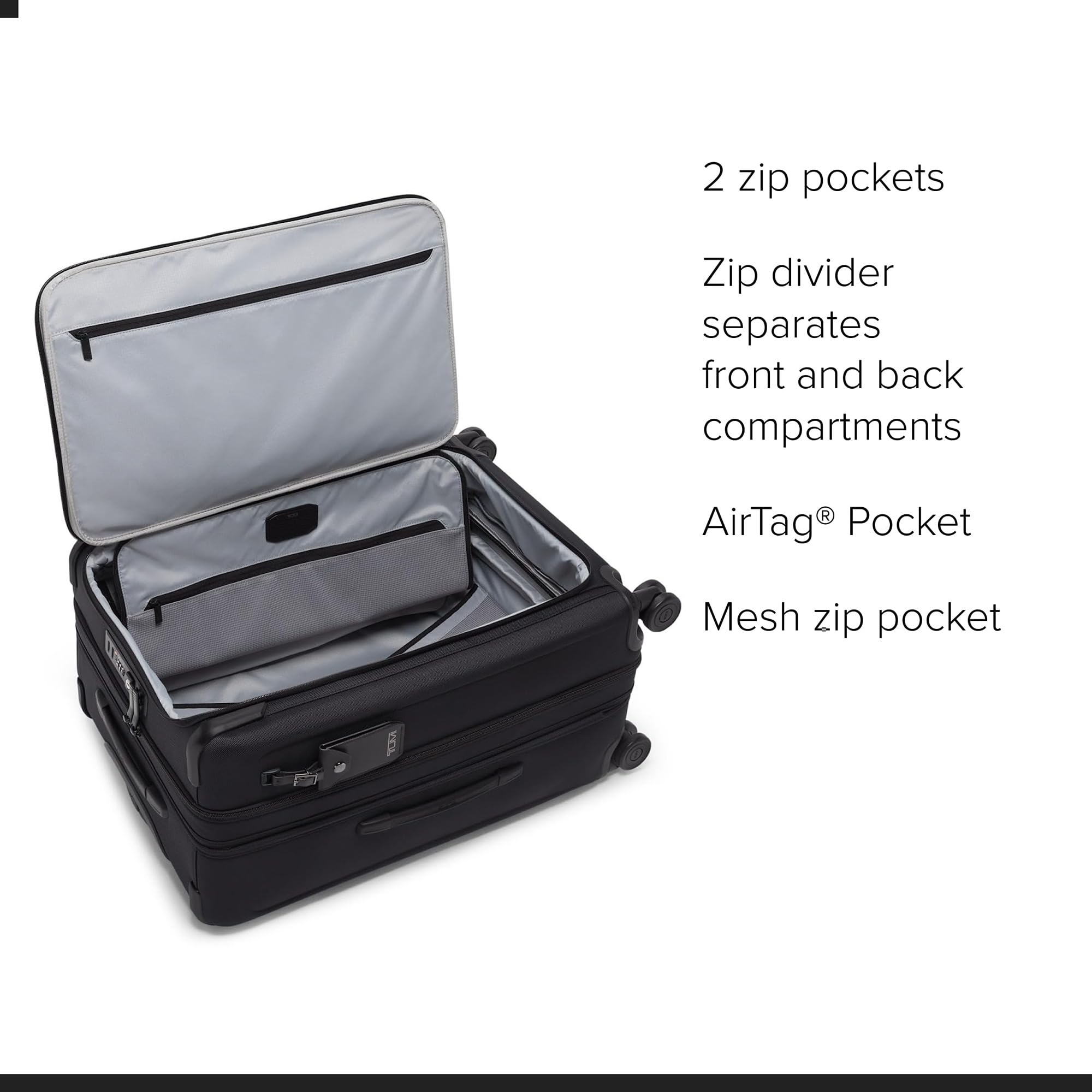 - Durable Travel Suitcase: The TUMI Medium Dual Access Expandable Checked Luggage is a stylish suitcase featuring FXT ballistic nylon for lasting resilience, along with built-in AirTag pocket