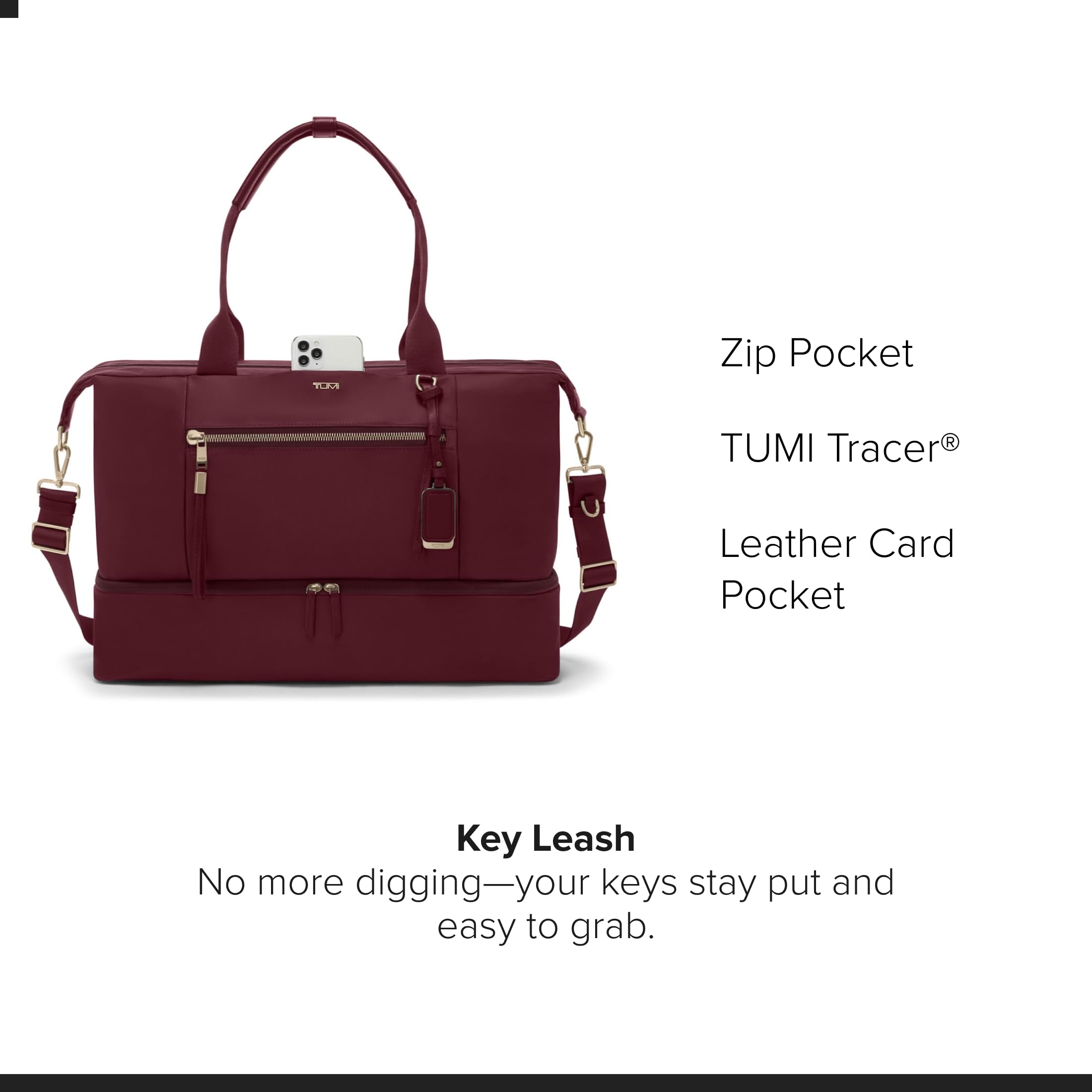 - NYLON BUILD WITH DETAILS: Made from nylon with TUMI Tracer and monogrammed detachable leather charm; includes water-resistant water bottle pocket and zippered entry to bottom compartment for easy use